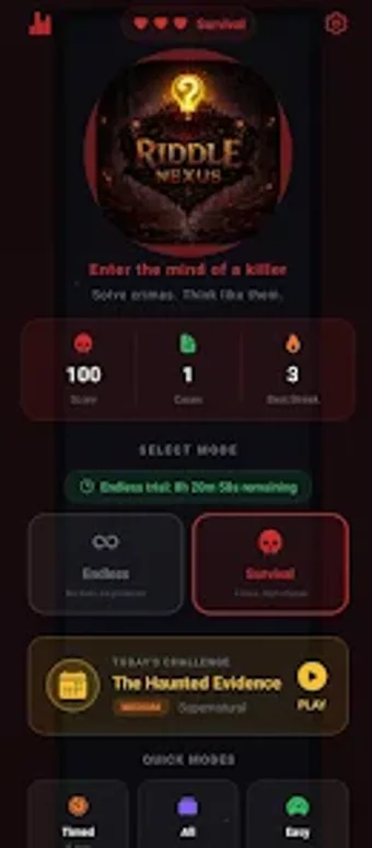 Riddle Nexus, mobil platformda sunulan en etkileyici psikolojik suç bulmaca oyunlarından biridir. Oyuncular, her biri benzersiz yapay zeka tarafından üretilen bilmeceleri çözerek dedektif becerilerini test etme fırsatı buluyor. Karanlık atmosfer tasarımı, ürkütücü görseller ve seslerle destekleniyor. Farklı zorluk seviyeleri sunan oyun, hem yeni başlayanlar hem de deneyimli oyuncular için çeşitli seçenekler içeriyor. Ayrıca, günlük meydan okumalar ve başarı sistemi ile oyuncular sürekli yeni içeriklerle karşılaşıyorlar.